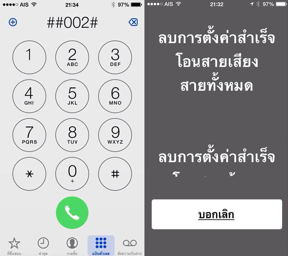 วิธียกเลิกการถูกตัดสายเข้าฝากข้อความเพื่อกินเงินฟรี โดยให้กด ##002#กดโทร ออก